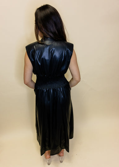 Elevate your wardrobe with this chic black leather midi dress that's equal parts edgy and elegant. The smocked waist creates a flattering silhouett...
