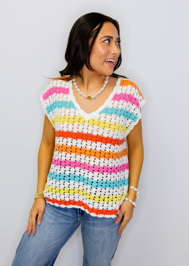 Brighten your wardrobe with this charming crochet top featuring bold stripes that pop! The relaxed, sleeveless silhouette offers effortless style p...