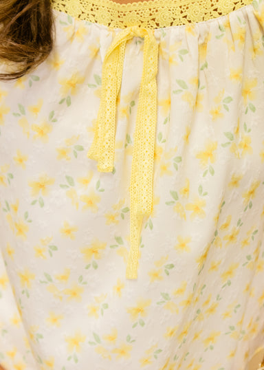 Embrace your sweetest style with this charming ivory top featuring delicate lace ruffles that dance along the edges. The blueberry print adds a whi...
