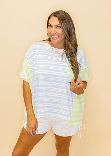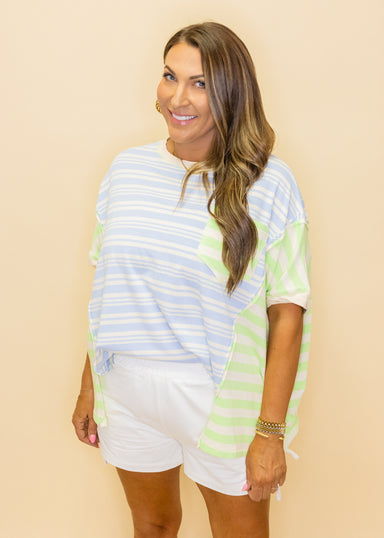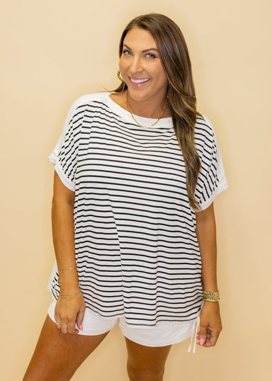 Embrace the season in this charming Jade Stripe Lace Button Top! Featuring delicate lace detailing and soft striping, this short-sleeve beauty stri...