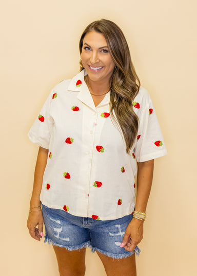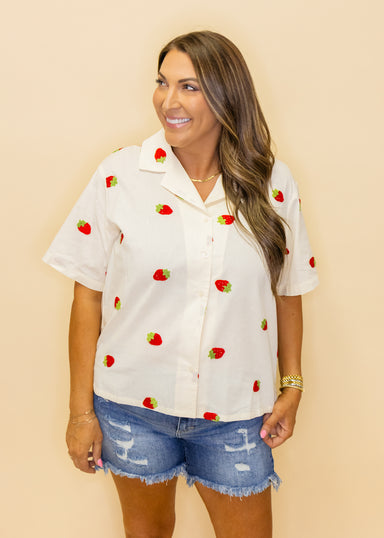 Brighten your warm-weather wardrobe with this cheerful cream top featuring a vibrant multi-colored summer print. Perfect for casual outings, beach ...