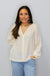 Embrace effortless elegance with this cream peasant top, where soft cotton-blend fabric meets artisanal charm. The split V-neckline and billowy sleeves create a romantic, relaxed vibe, while intricate braided detailing along the neckline and seams adds that handcrafted touch. Gently gathered cuffs keep things playful and feminine. Perfect for pairing with your favorite denim, flowing skirts, or layered jewelry—this versatile piece transitions seamlessly from casual days to dressed-up nights. Breathable and beautifully draped, it's your new go-to for comfort without compromising on style.