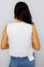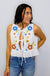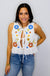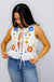 Embrace effortless charm with this white embroidered tie vest, crafted from breathable cotton gauze that feels as good as it looks. Delicate floral embroidery adds a whimsical, handmade quality, while subtle quilting provides just enough structure for all-day wear. The smooth inner lining glides on seamlessly, and three adjustable ties let you customize your silhouette for that perfect layered vibe. Finished with a playful ruffle hem that dances with every move, this versatile piece pairs beautifully with everything in your closet.