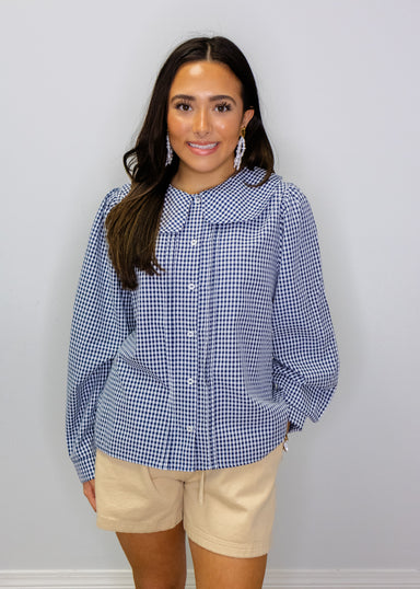 Step into timeless charm with this Hunter Green Gingham Peter Pan Collar Top! The classic gingham pattern pairs perfectly with a whimsical oversize...
