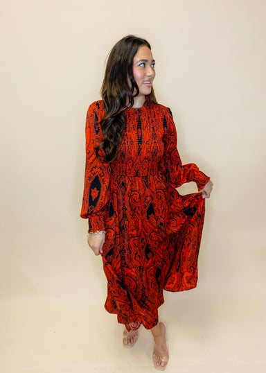 Stand out in style with our Orange Print Smocked Dress! This playful midi dress features a feminine frilled neck and elegant paisley print, while t...