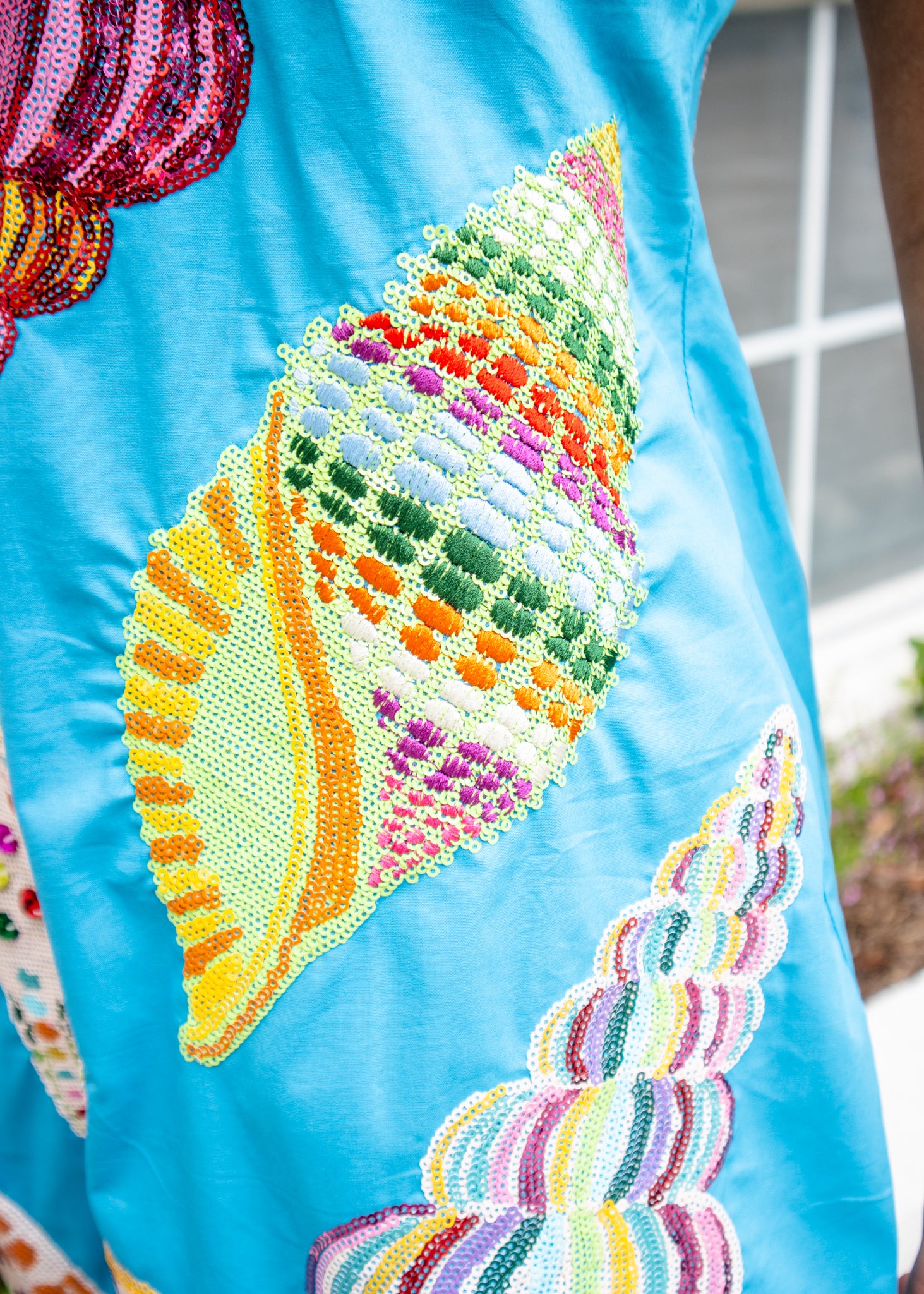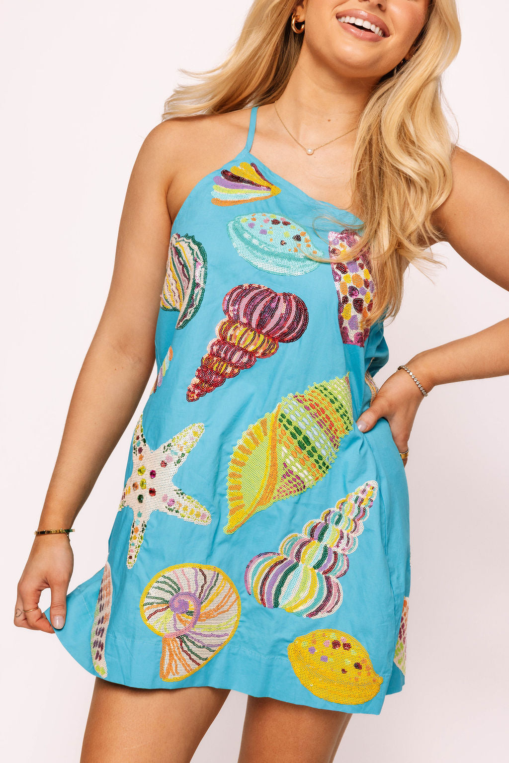 Make a splash this summer in our Aqua Multi Shell One Shoulder Cotton Dress! This playful piece features eye-catching sequin and rhinestone details that catch the light with every move. The unique shell-inspired design and one-shoulder silhouette create a bold beach-ready look that's perfect for turning heads at sunset parties or seaside adventures. Shine bright in this dazzling cotton creation!