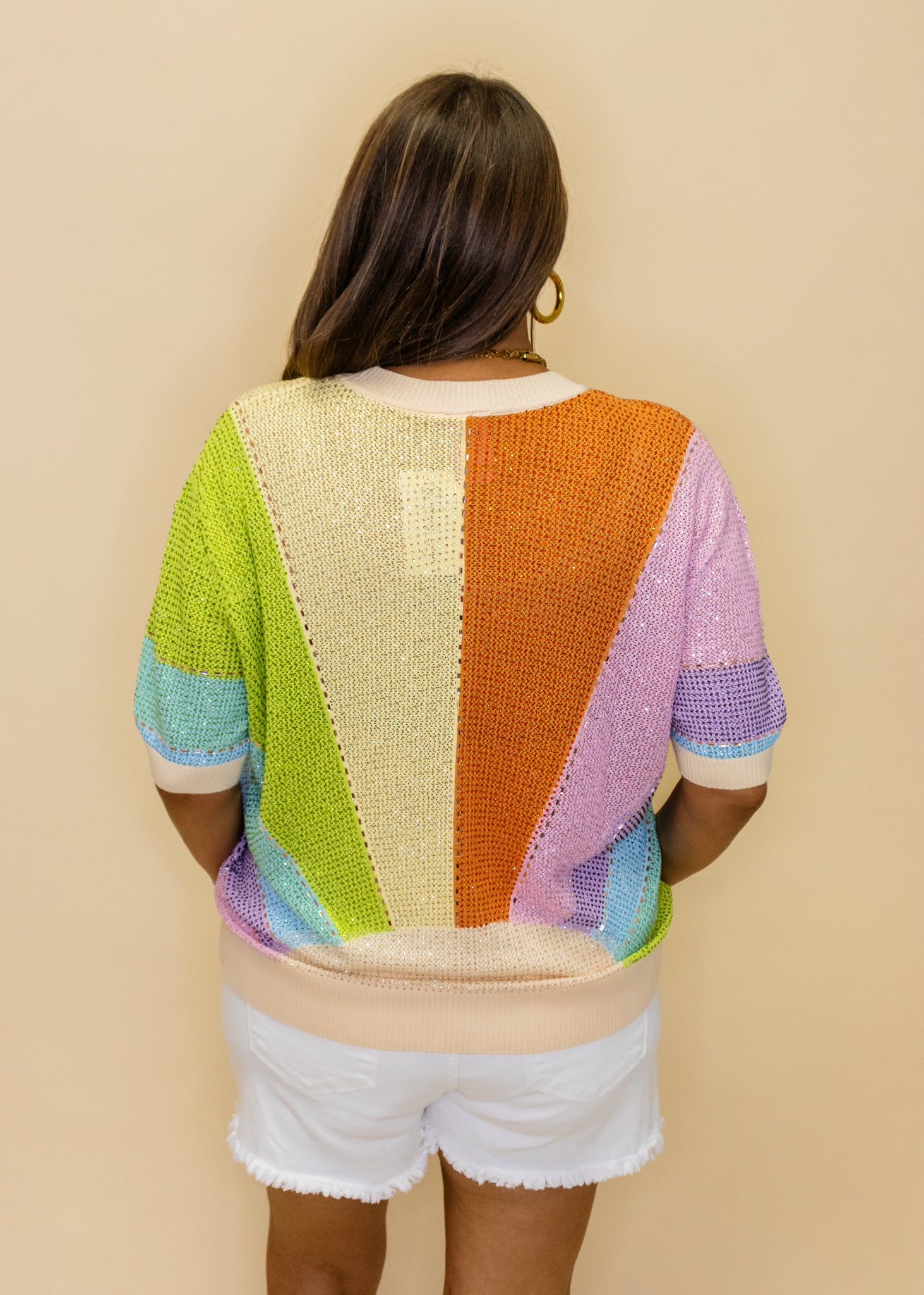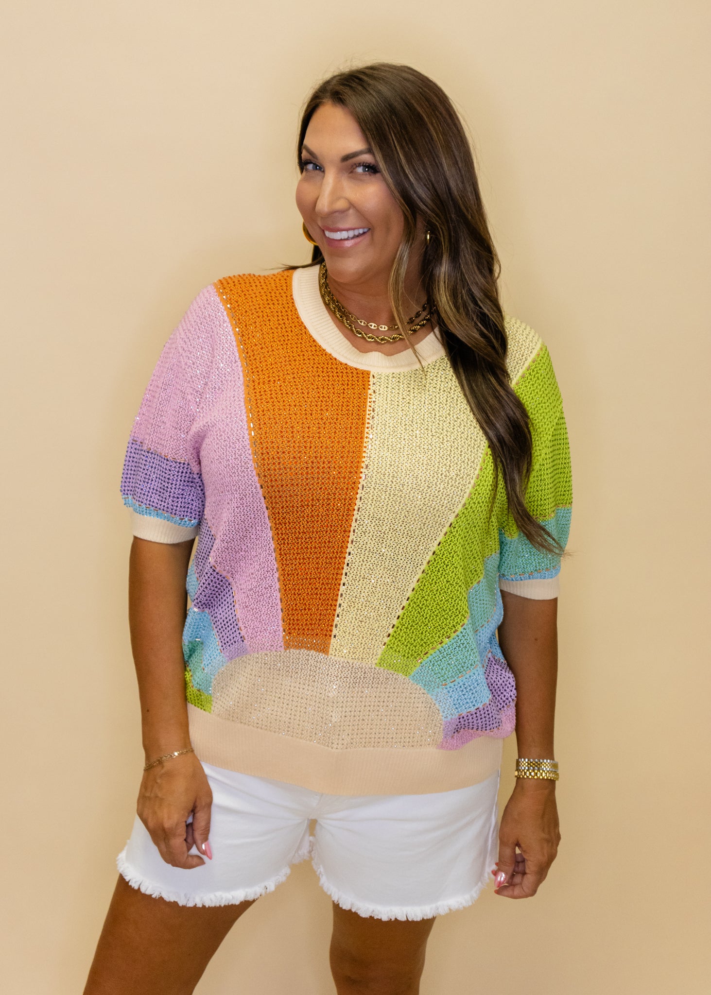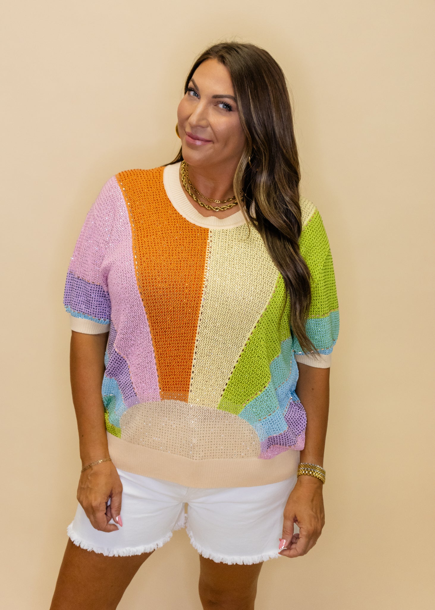 Muted Rainbow Rhinestone Sunshine Short Sleeve Sweater