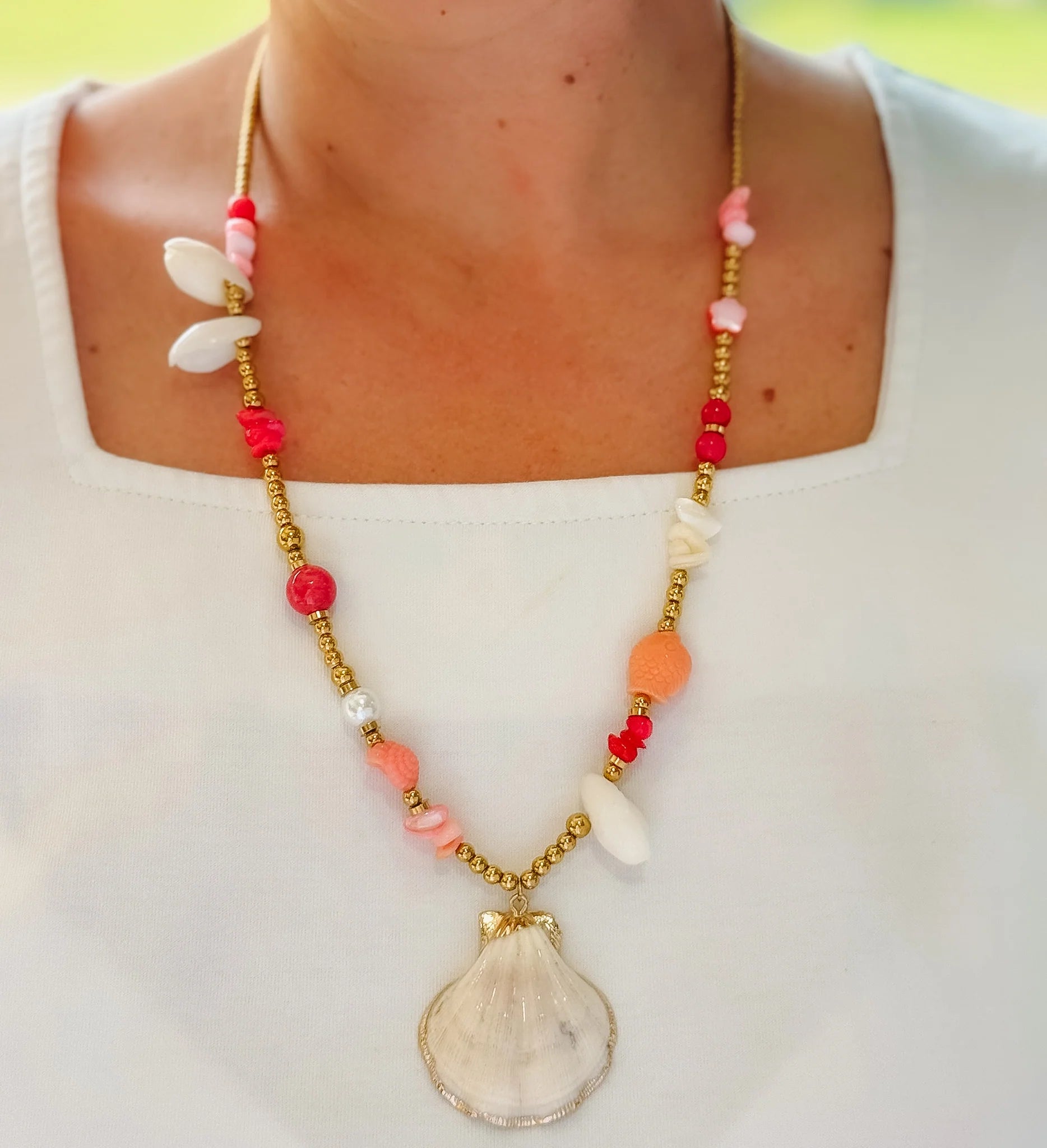 Dive into coastal charm with this Ocean Breeze Beaded Necklace. Vibrant fuchsia beads are paired with delicate seashell accents, creating a fresh, ocean-inspired piece perfect for beach days or adding a pop of color to any outfit. This lightweight necklace brings a touch of seaside elegance to your everyday style.