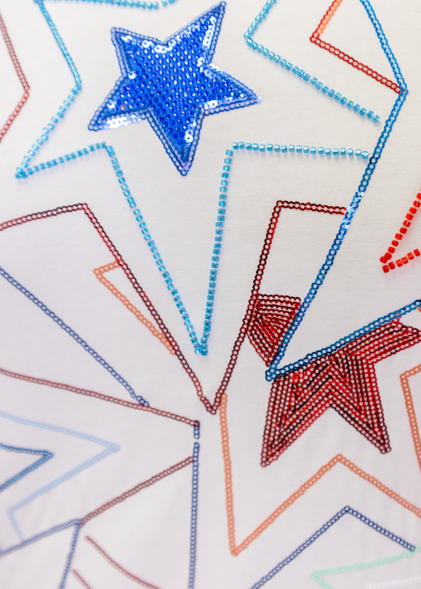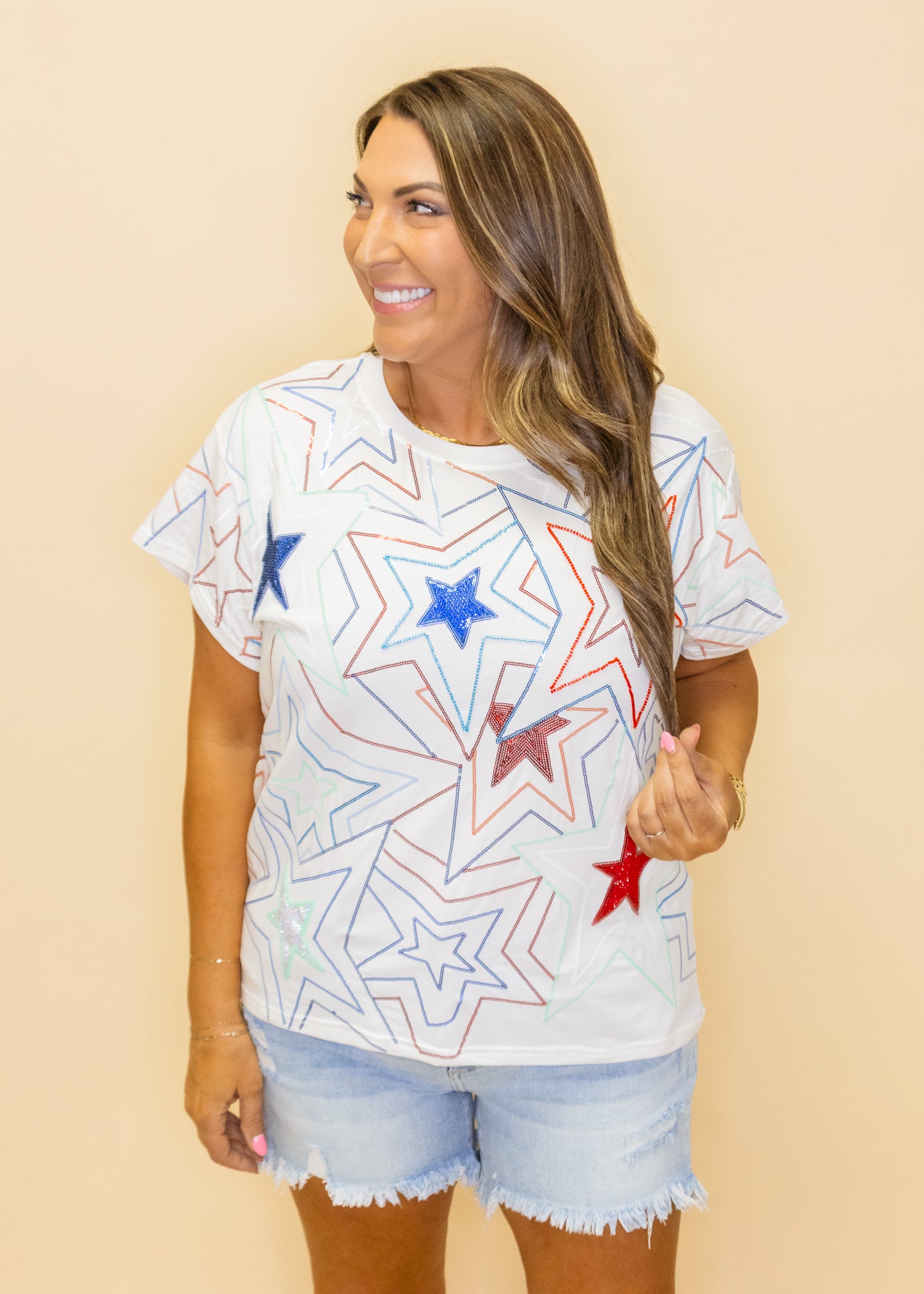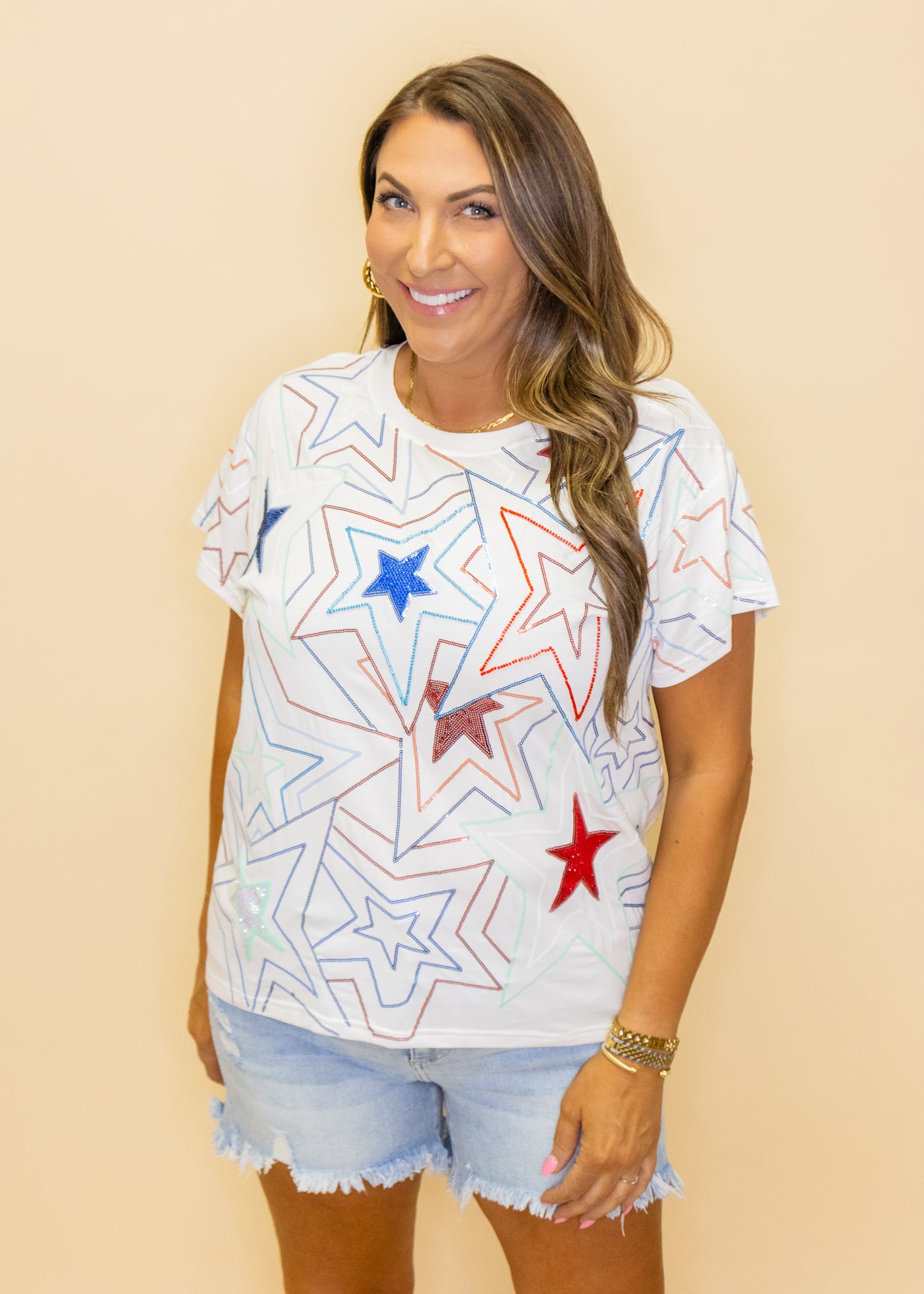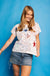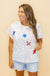 Get ready to shine and stand out in this White, Red, & Blue Groovy Star Tee! With its sequin stars, you'll sparkle and turn heads wherever you go. Embrace your groovy side and rock this playful shirt.
